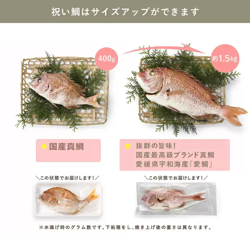 | ●祝い鯛姿焼き1.5kg(水揚げ時加工前1.5kg下処理焼き加工後800g)) | 愛媛県宇和海産養殖真鯛、食塩 |