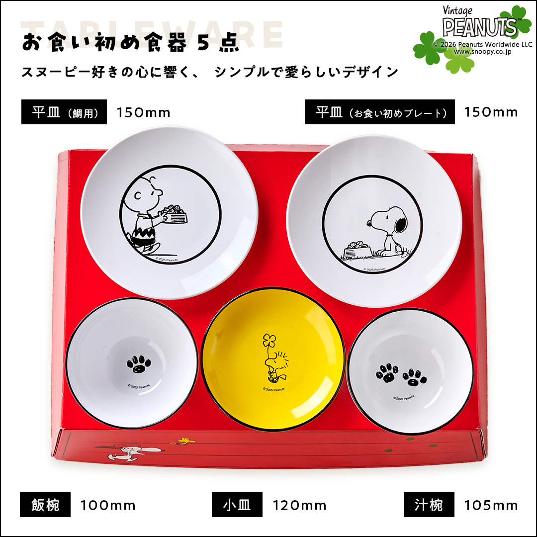 食器をご用意いただく必要なし!スヌーピーと仲間たちがデザインされたお食い初め食器セット。毎日の食卓にも馴染むデザインとサイズ感で普段使いにも大活躍。