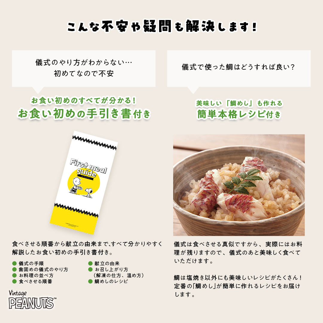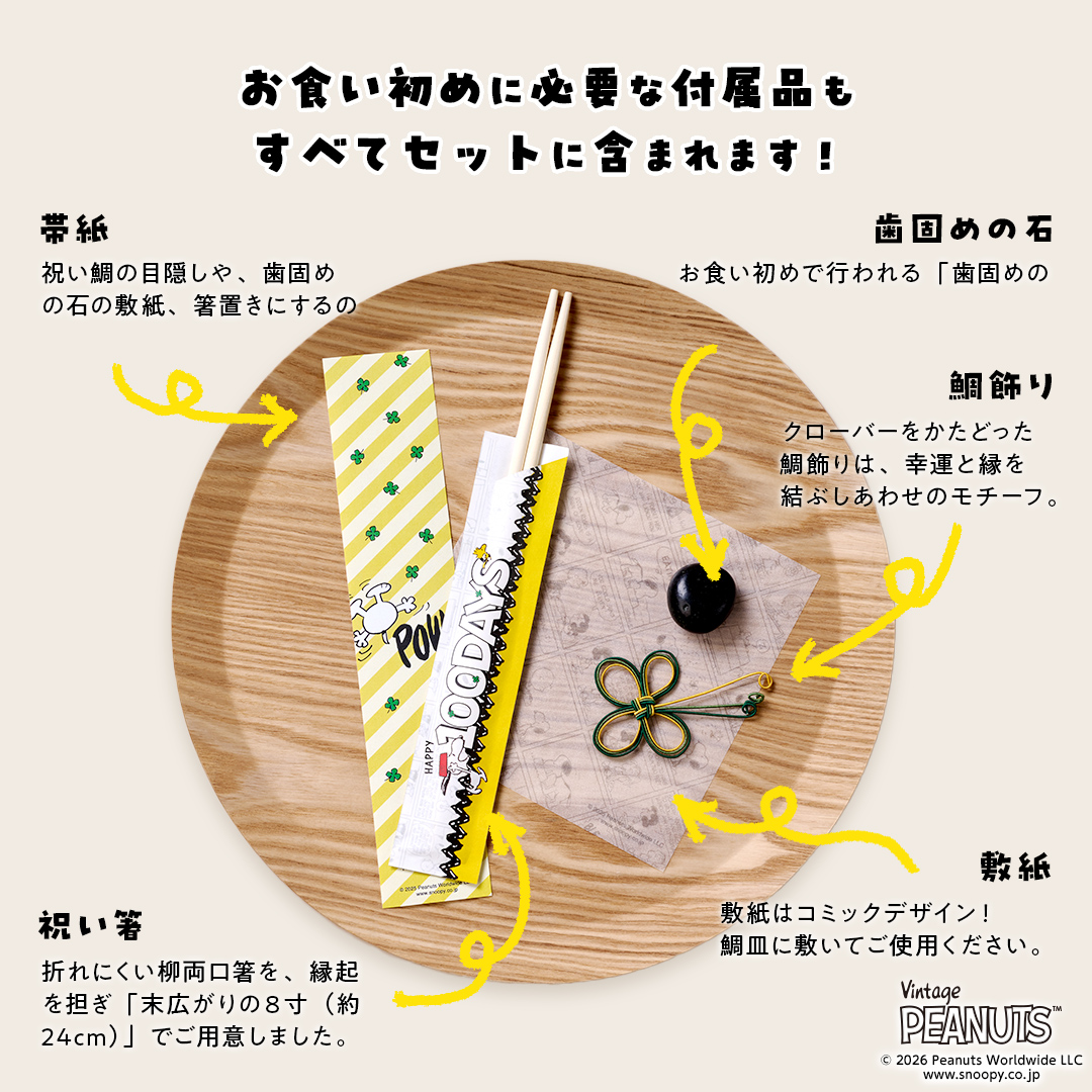 一生に一度の儀式をスヌーピーデザインのお祝い膳で楽しくお過ごしください。