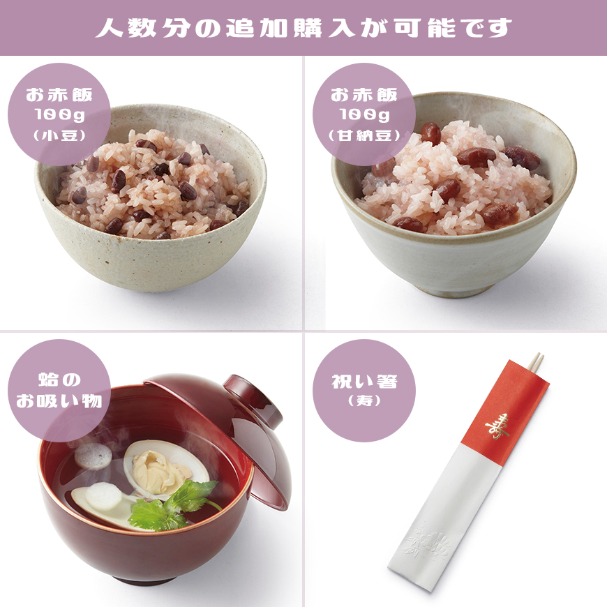 そんなときの為に、お食い初め重のみを追加でご購入いただけるようになっております。是非皆様でお召し上がりください。
