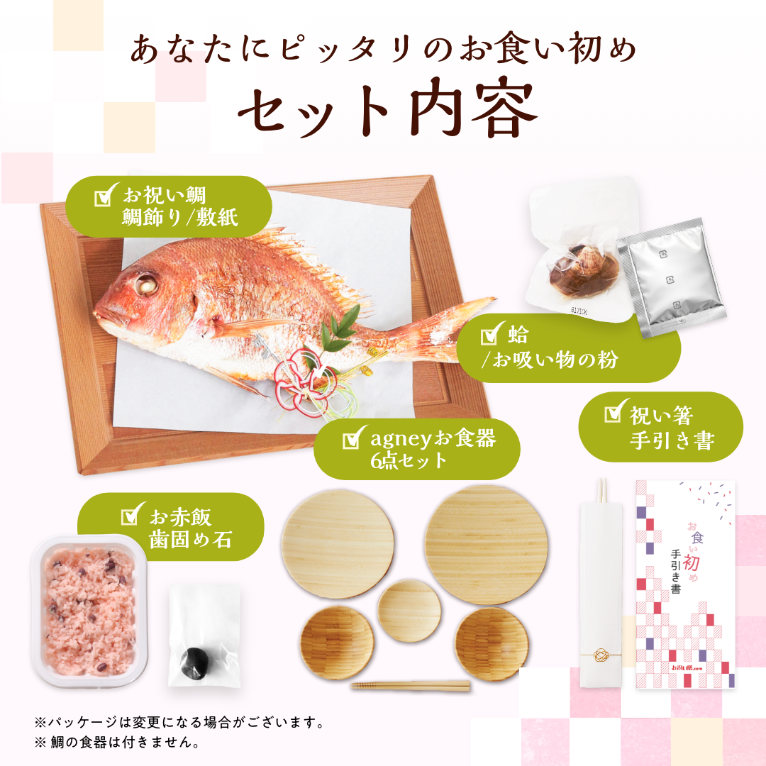 飾り付きのお祝い鯛、お赤飯、蛤のお吸い物、祝箸、歯固め石、ご自宅で用意がしづらいものを中心に、