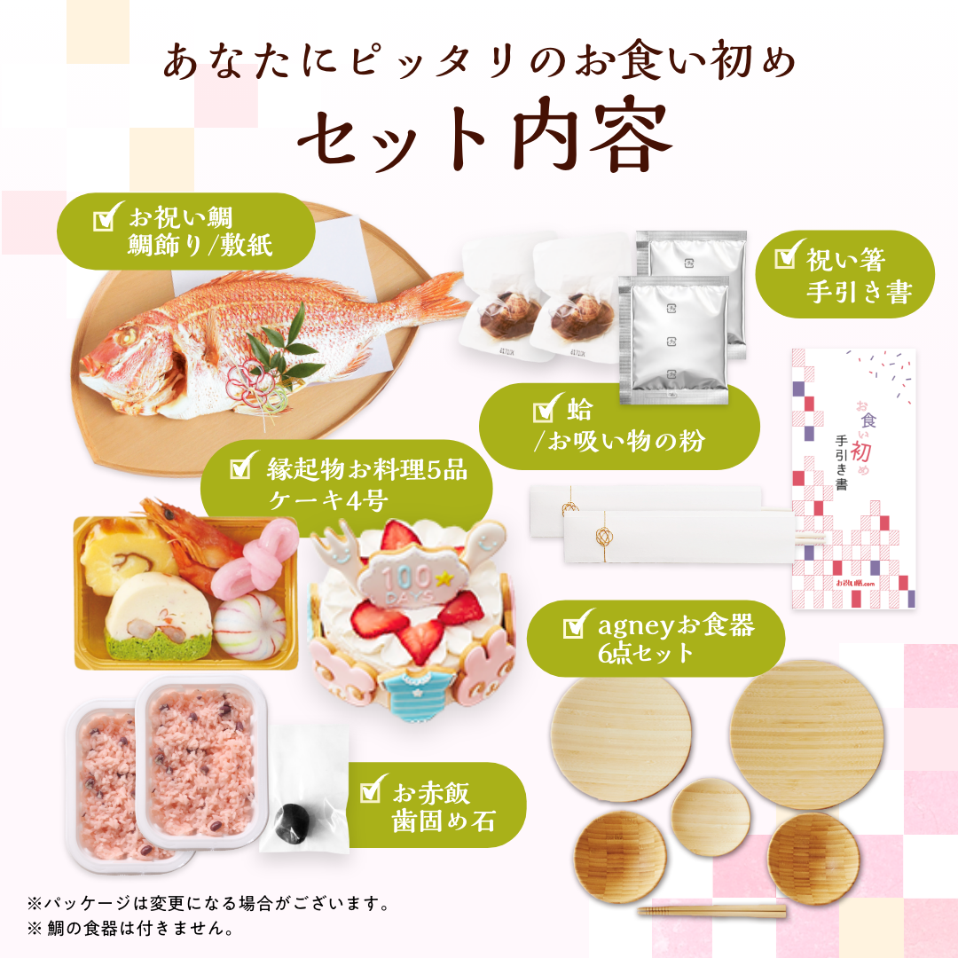 儀式の手順などを詳しく解説した手引き書付きで、初めてのお食い初めでも安心です。