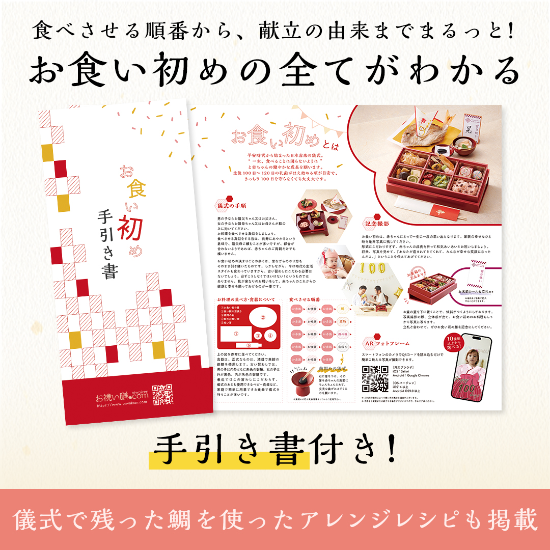 歯固めの石や、儀式の手順などを詳しく解説した手引き書も付いているので、初めてのお食い初めでも安心。