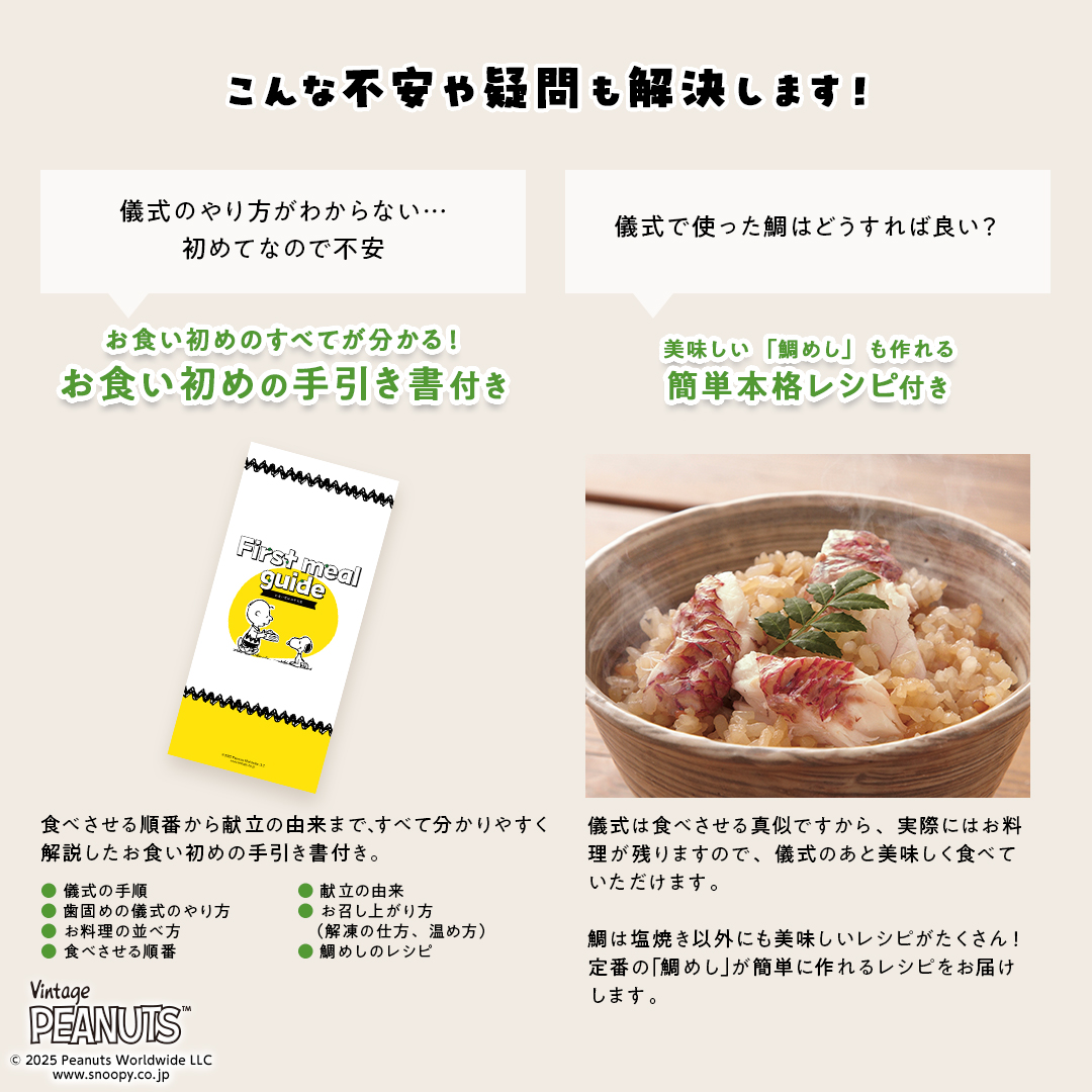一生に一度の儀式をスヌーピーデザインのお祝い膳で楽しくお過ごしください。